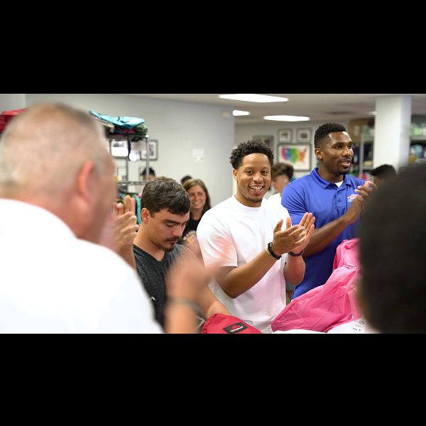 Eager to get started, the four Globetrotters each paired off with one of Rob’s sons to show them how to pack a Comfort Case. Comfort Cases are tailor-made for different age groups, including some for babies, some for toddlers, some for grade school-aged kids, and others for older adolescents and teens.